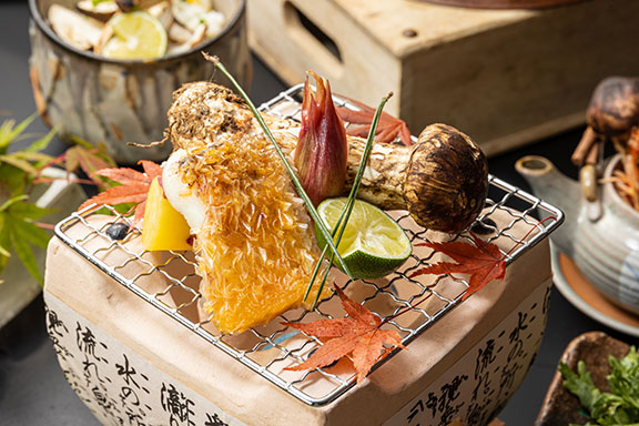 This special seasonal plan offers a dinner showcasing the finest domestic matsutake mushrooms in abundance. At a historic ryokan restaurant in the castle town with a 400-year legacy, we present matsutake prepared in a variety of styles—such as dobin-mushi (steamed in a clay teapot), grilled matsutake, and matsutake sushi. Savor to your heart’s content the refined taste, rich aroma, and crisp texture of this exquisite delicacy with all five senses.